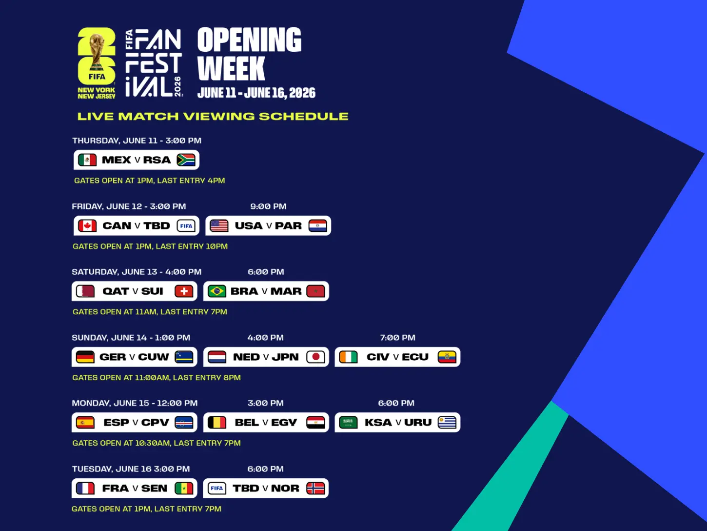 - Available: Opening Week Ticketing for FIFA Fan Festival™ NYNJ! See above for the Opening Week Match Viewing Schedule and stay tuned as more dates become available.